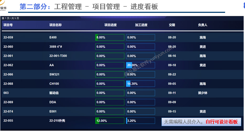 项目加工进度:从项目的角度,并依据装配关系,以甘特图的形式树状展示各零件的加工进度,也可以查询采购、外协的相关进度。