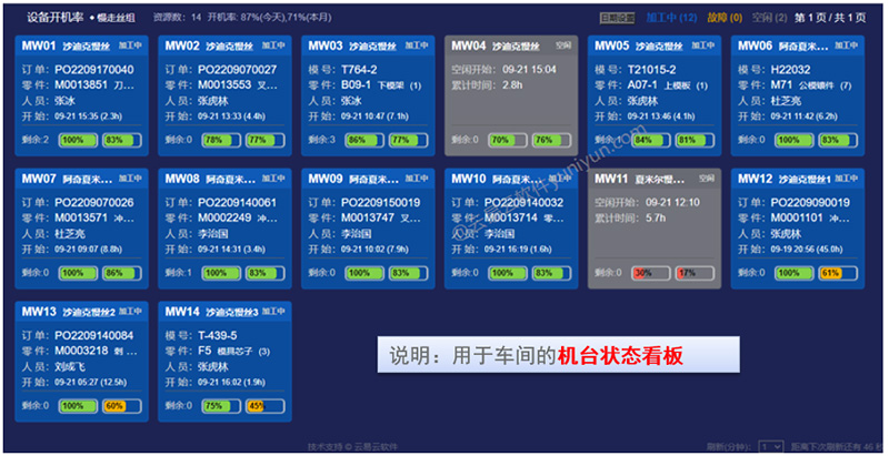 现场报警看板:对现场反馈设备异常、加工异常进行跟踪,监督异常的处理进度,对安排的生产任务进行跟踪,查看任务的开工、完工情况。